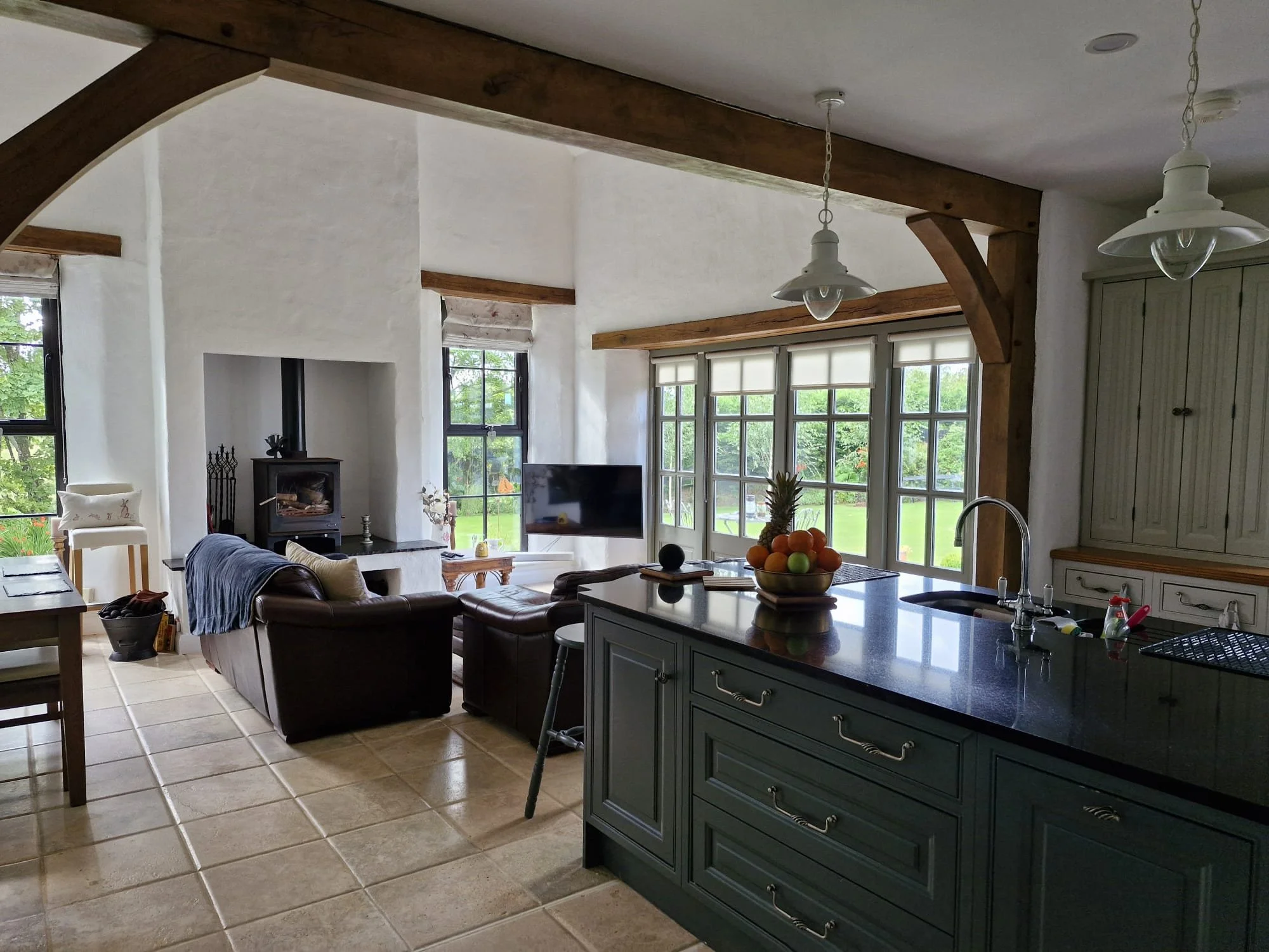 The home features a stunning open-plan living and kitchen area, highlighted by traditional oak beams and a cosy wood-burning stove—the perfect setting for relaxing evenings.
